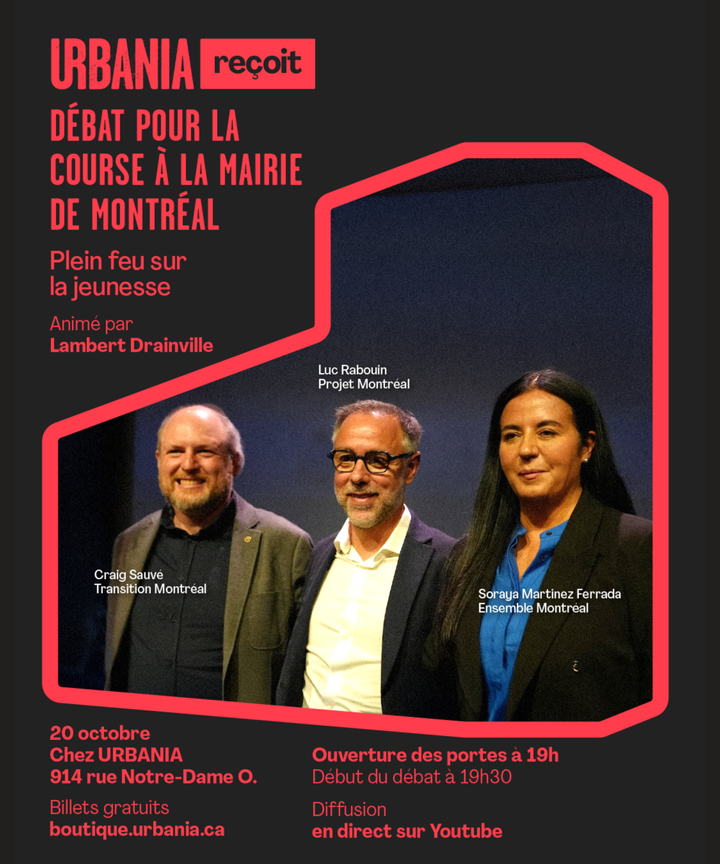 Le 20 octobre, rendez-vous chez URBANIA pour un face-à-face politique entre Luc Rabouin (Projet Montréal), Soraya Martinez Ferrada (Ensemble Montréal) et Craig Sauvé (Transition Montréal).